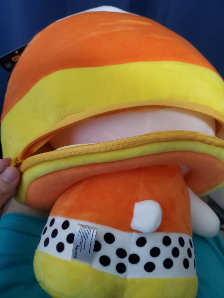 Unique characteristics: I’ve never seen a Candy Corn Hello Kitty plush, so that’s a first for me. Secondly, the costume is removable, so if you get your plush and aren’t satisfied with the overall look of the costume, you can always remove it. As you can see in the pictures below, the back has a zipper to create a large opening that will allow you to pull her head through.